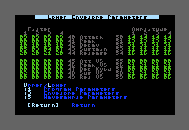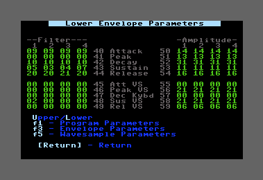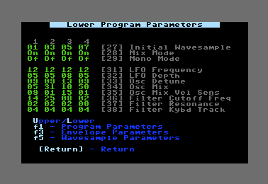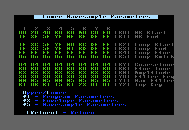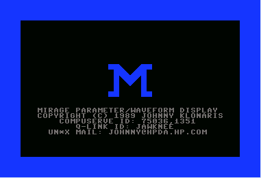 The M program has several displays. Due to limitations of my C64 X-windows emulator, the main waveform display, which is in hi-res graphics mode, is not available for display here. That display shows one page of the Mirage's memory (256 samples) graphically, with a side bar that indicates the bank, page and sample, as well as the wavesample begin, end and loop begin and end.